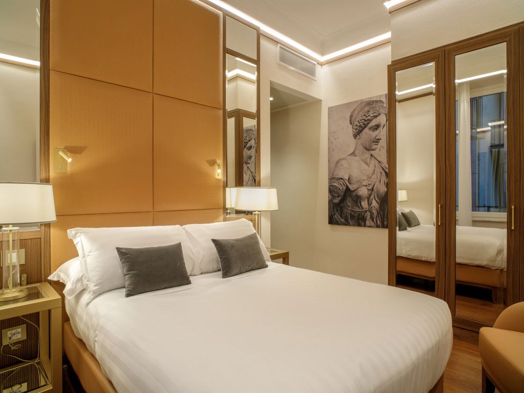 Starting from 13 sqm in size, they are equipped with a 1.40 m French bed. Each room includes a personalized OMNIA Hotels courtesy line, free Wi-Fi, smart TV, minibar, air conditioning, safe, and a desk.