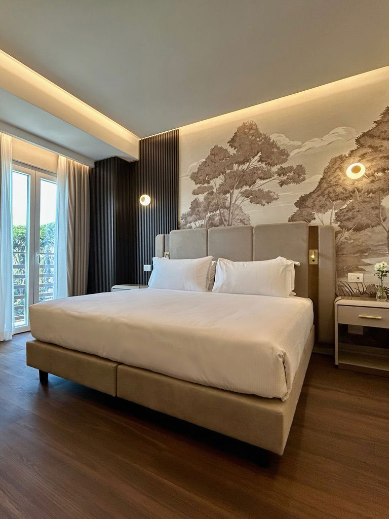 La camera da letto, luminosa ed elegante, presenta arredi moderni dalle linee pulite e colori caldi e rilassanti, con una piacevole vista sulla piscina. L’area salotto, immersa nel verde, è perfetta per rilassarsi o lavorare in totale comfort.