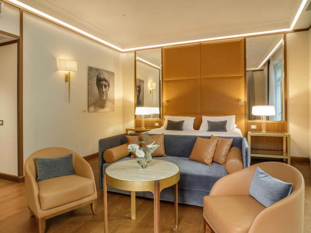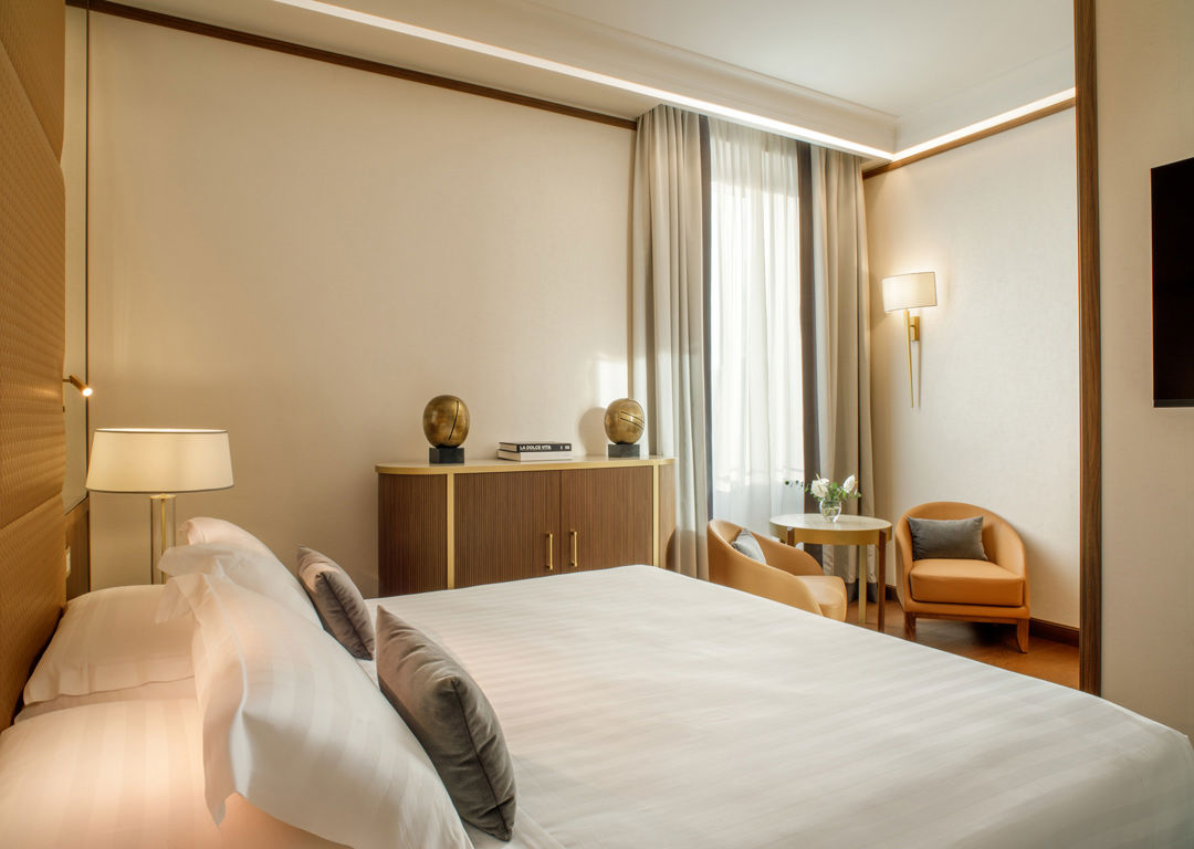 La Dolce Vita Suite, con una superficie a partire da 34 m², è composta da due ambienti separati, tra cui un soggiorno con sofa bed singolo e un ampio terrazzo con vista su Via Veneto.