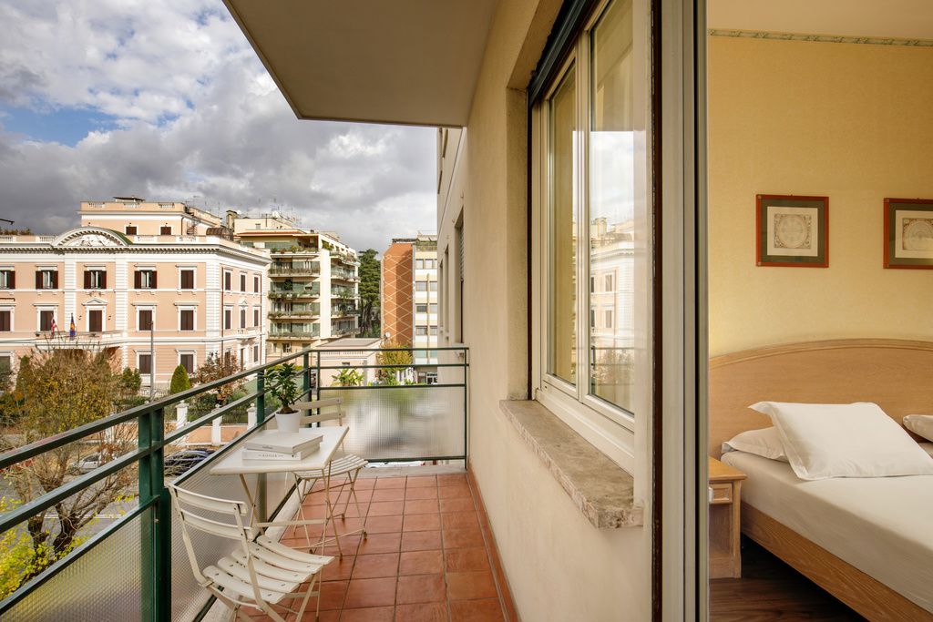 Camera Omnia Classic da 16 mq, chiare e luminose, i pavimenti in parquet e l'arredamento confortevole ed accogliente le rendono la soluzione ideale per un soggiorno tranquillo immerso nel verde del quartiere Nomentano.